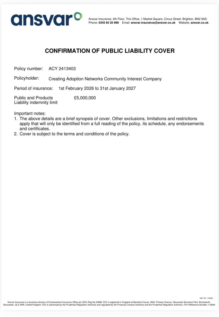 This policy applies to anyone working on behalf of Creating Adoption Networks